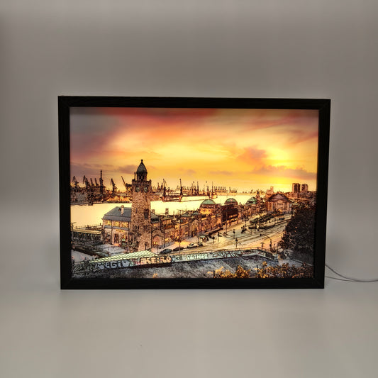 Lampe mit Motivbild, Landungsbrücken Hamburg bei Sonnenuntergang, 3 Lichtstufen