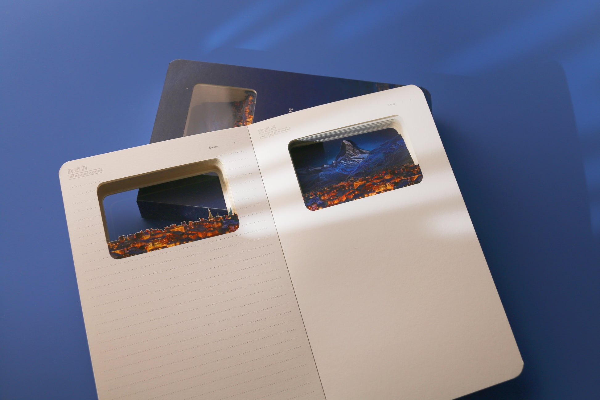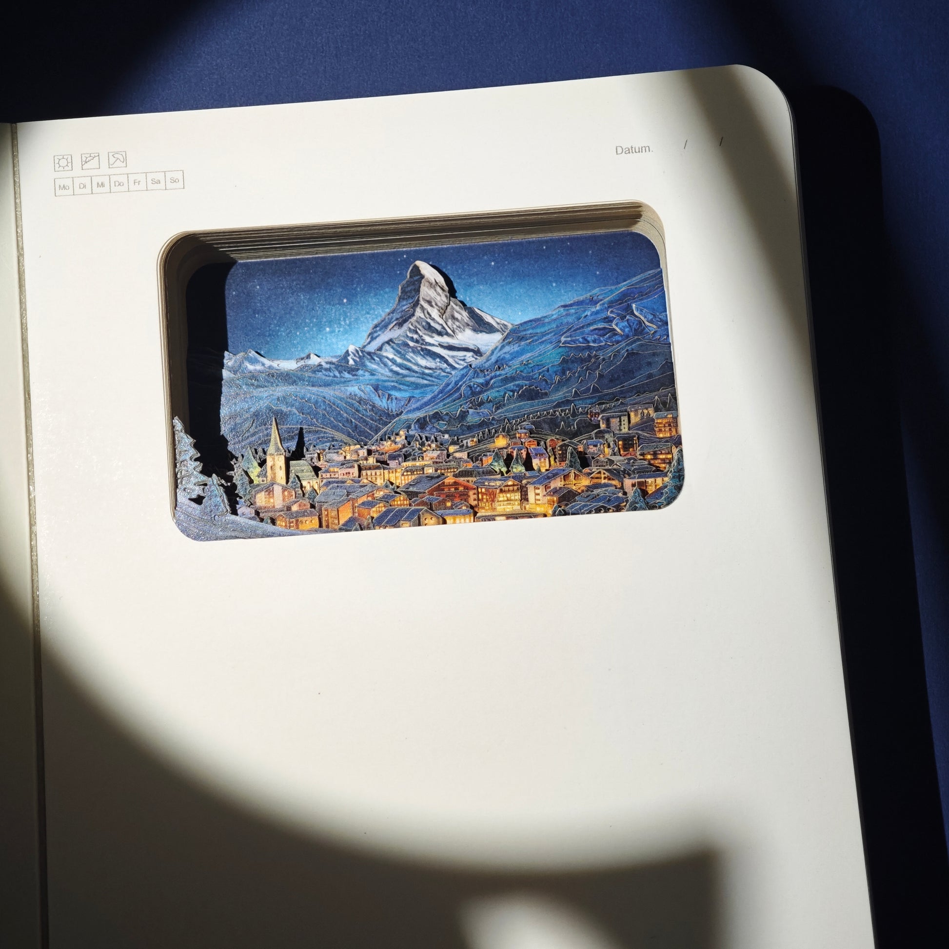 Dieses außergewöhnliche Notizbuch kombiniert hochwertige Schreibfunktion mit einem faszinierenden visuellen Erlebnis. Auf dem Cover öffnet sich ein tiefes Fenster mit einer fein geschichteten Darstellung des Bergdorfs Zermatt bei Nacht, dominiert vom eindrucksvollen Matterhorn unter dem Sternenhimmel. Dank präziser Laserschnitttechnik wirkt die Szene lebendig und detailreich – als würde man selbst durch das Fenster in eine verschneite Alpenwelt blicken.
