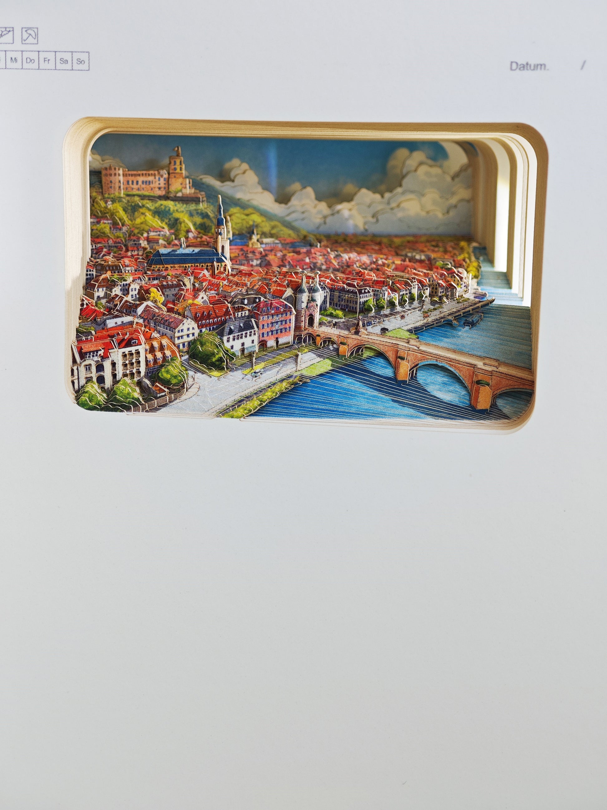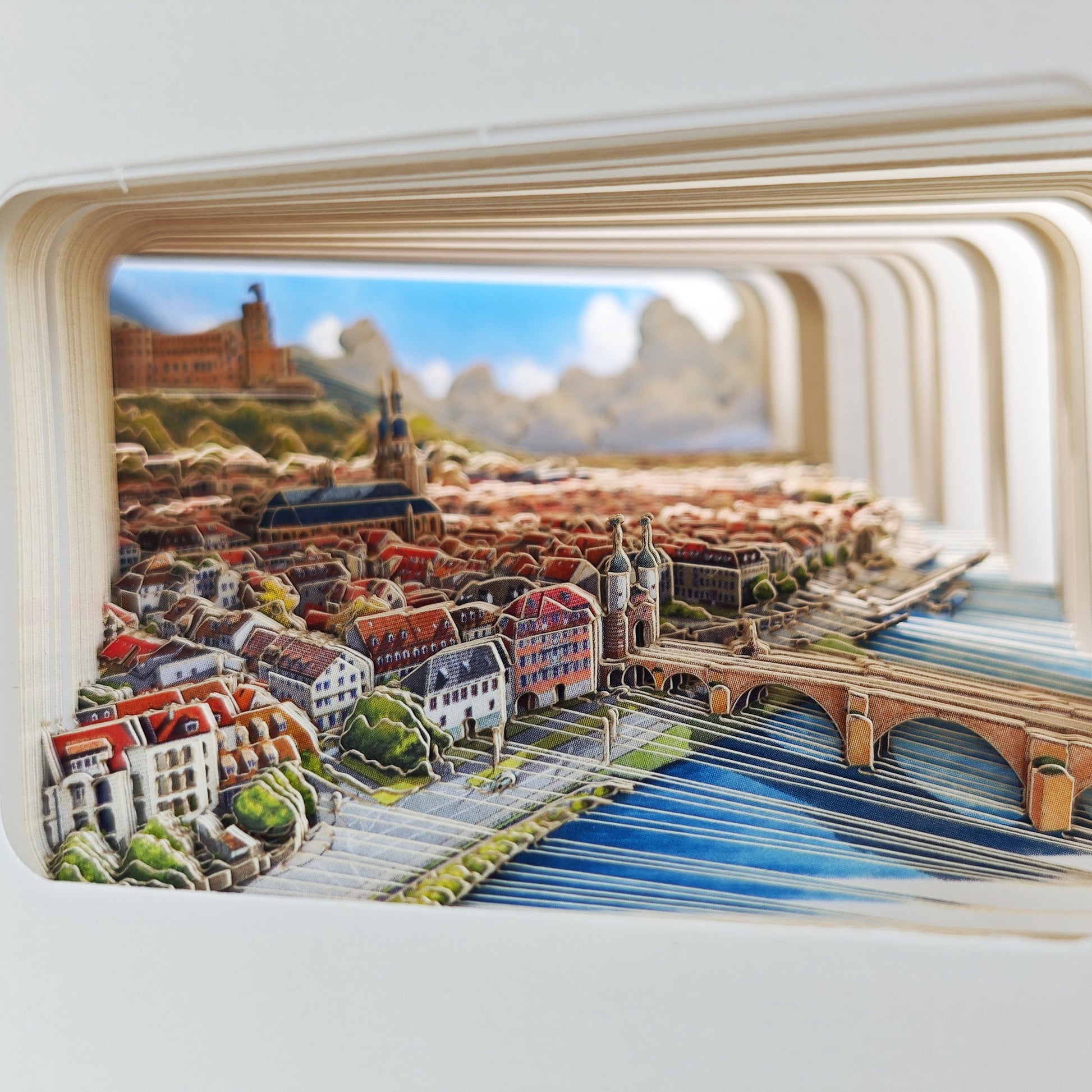 3D-Stadtlandschaft: Die Vorderseite präsentiert durch ein Sichtfenster eine detailreiche Szene mit Schloss, Altstadt und Neckarbrücke – kunstvoll als Schichtenpapier gestaltet.