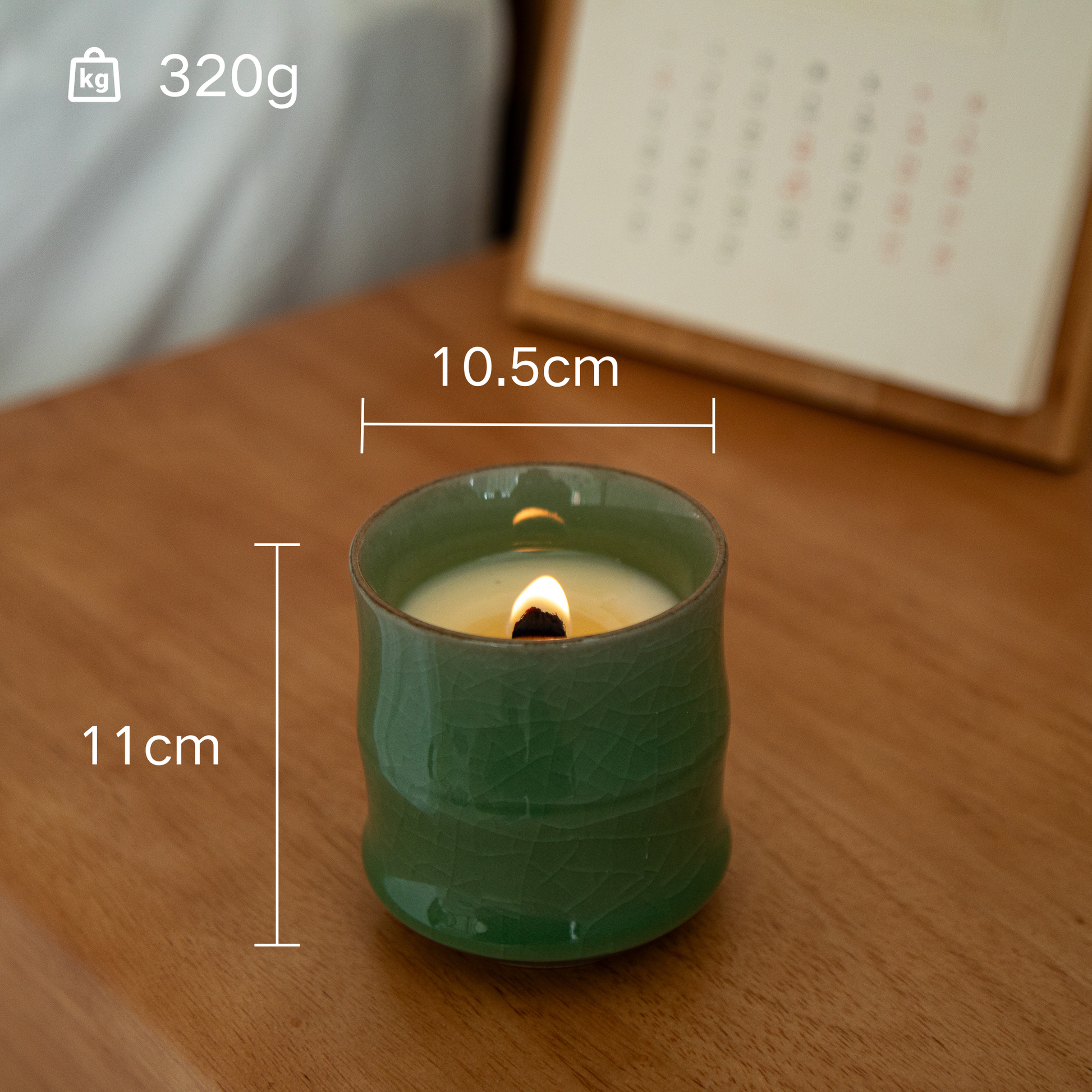 Bring the tranquility and elegance of nature into your home with our Crackled Ceramic Vessel Candle . This candle exudes the calming scent of green tea and is housed in a stylish Old Plum Green ceramic vessel.