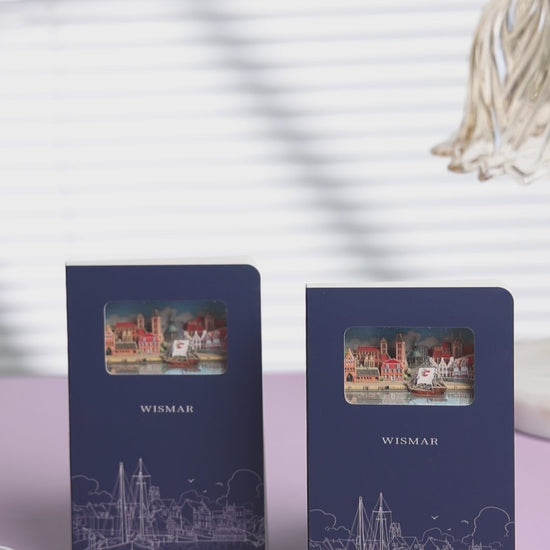 Dieses 3D-Papierkunst-Notizbuch zeigt die historische Altstadt von Wismar, ein UNESCO-Weltkulturerbe an der Ostseeküste. Backsteingotik, Hafenleben und maritime Architektur verbinden sich zu einem stimmungsvollen Stadtbild voller Geschichte und norddeutschem Charme.